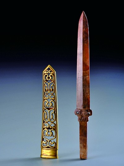 韩城梁带村芮国博物馆展出的文物玉剑金鞘。李博摄