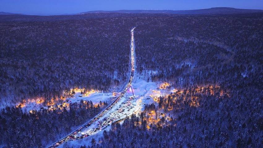 夜晚航拍镜头下,车流与灯光点亮林海。(延边州委宣传部供图)