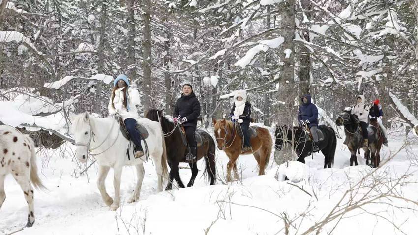 游客身着厚装林间骑马期配宝,马蹄踏雪,冬日野趣尽显。(延边州委宣传部供图)