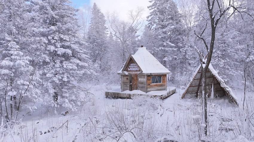 林间小木屋被厚雪覆盖,宛如童话场景。(延边州委宣传部供图)