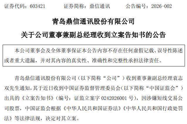 鼎信通讯表示,本次事项系对袁志双个人的调查,不会对公司日常经营活动产生重大影响。立案调查期间,公司及相关人员将积极配合证监会开展调查工作。